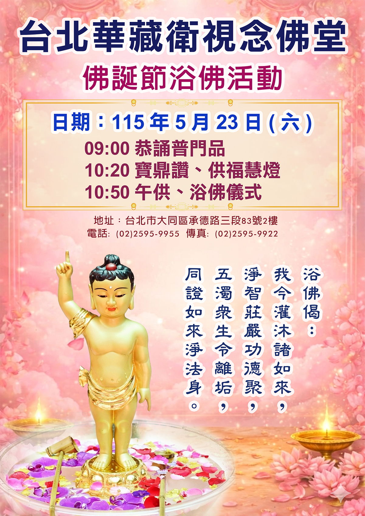 敬邀5月23日(星期六)闔家蒞臨台北華藏衛視念佛堂浴佛慶典,以至誠心感恩佛陀,藉著浴佛的儀式,洗滌內心的煩惱塵垢,使我們的心恢復光明,讓我們的人生幸福美滿。